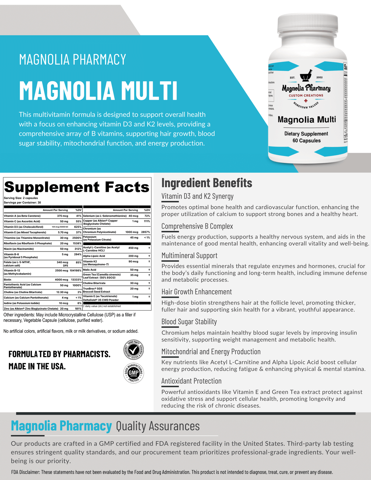 Magnolia Multi is designed to support overall health with a focus on enhancing vitamin D3 and K2 levels, providing a comprehensive array of B vitamins, supporting hair growth, blood sugar stability, mitochondrial function, and energy production.